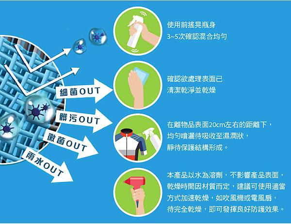 按照瓶身上的使用說明,我在使用前先搖晃瓶身幾次讓內容物混合均勻;接著在離外套表面 20cm 左右的距離下均勻噴灑到濕潤;等乾燥後保護結構就理應形成啦。噴噴!