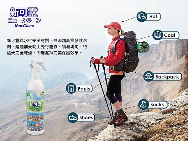 一瓶「NewClean 新可靈奈米長效保潔劑」,就可以把帽子衣服背包鞋子衣褲連襪子通通都防護,有防水、抗 UV、抑菌、防霉多功能的效果。滿便利。