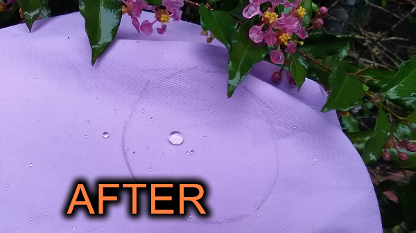 第一件我拿來試用「新可靈」長效保潔劑的日用品,是我騎摩托車慣常穿來防風遮陽的薄外套。好幾年的舊外套了,輕便,但是完全沒有防水功能、淋到多少雨水就吸多少雨水就像泥土一樣,噗噗。成為我的試驗品一號。為了觀察使用效果,我特別在外套上用 2B 鉛筆畫一個「試用區」的觀察圈圈,在小雨中觀察吸水的情況。吸了水的布料成為斑斑點點較深的斑駁紫色。