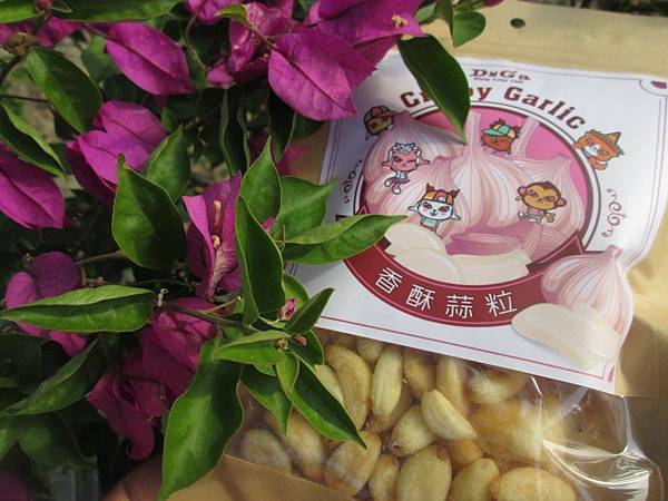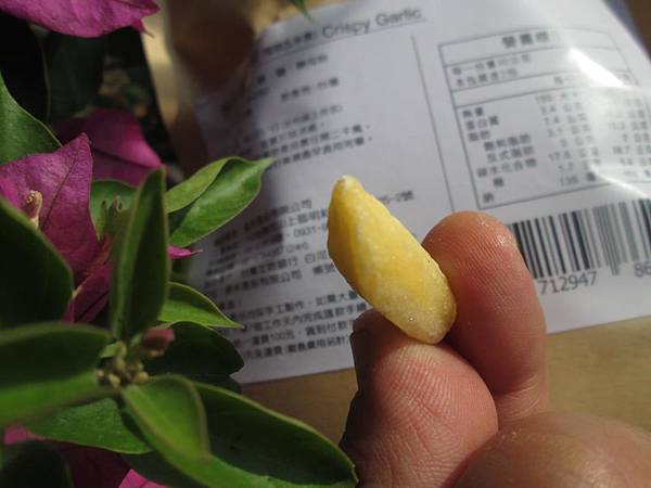 一粒粒去除蒜皮後完整蒜粒乾燥處理,吃起來充滿大蒜氣味、剛吃完大概滿嘴都蒜味連德古拉伯爵都要閃;口感則酥脆得已經是餅乾級口感了,經過咀嚼後蒜辣味隨食道而下頗帶勁。