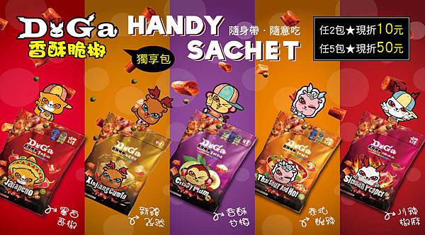 「 DoGa香酥脆椒獨享包」五種口味:「墨西哥椒」、「香酥甘梅」、「泰式酸辣」、「新疆孜然」及「川辣椒麻」;