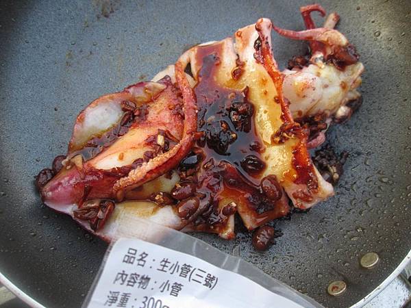 用剪刀先橫再縱剪開並攤開小卷、起油鍋後直接乾煎,待兩面都煎上色後淋上醬。這次我用的醬料是豆醬混合醬油、糖、生薑末,淋上醬後等聞到醬油焦香味後關火。