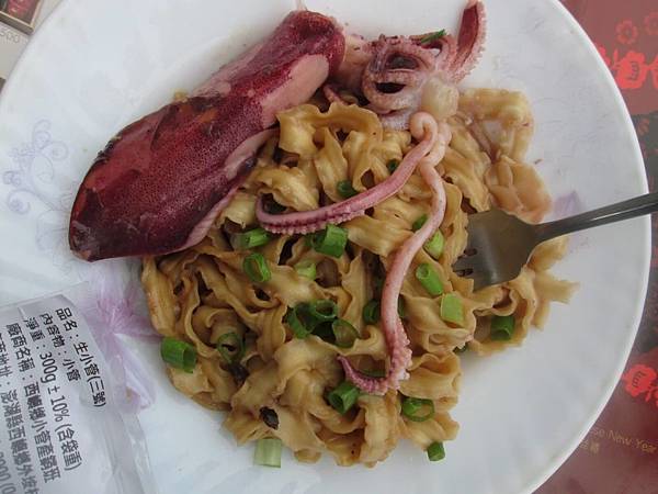 新鮮小卷用油稍微煎一下上色熟透後灑點胡椒鹽起鍋,擺上剛煮好的麵感覺好海派!這道「整條小卷拌麵」充滿新鮮海味,開心!當然啦,真的開吃時小卷還是要用剪刀剪成適口大小比較容易吃……當然直接用牙齒咬會更海派,哈哈哈。
