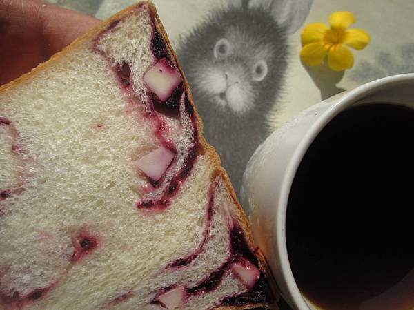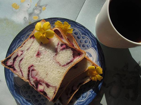 切開「桑葚優格吐司」成片,可以欣賞到吐司裡由紫色桑葚描繪的幾何線條、間或還嵌著塊狀白色優格乳酪。