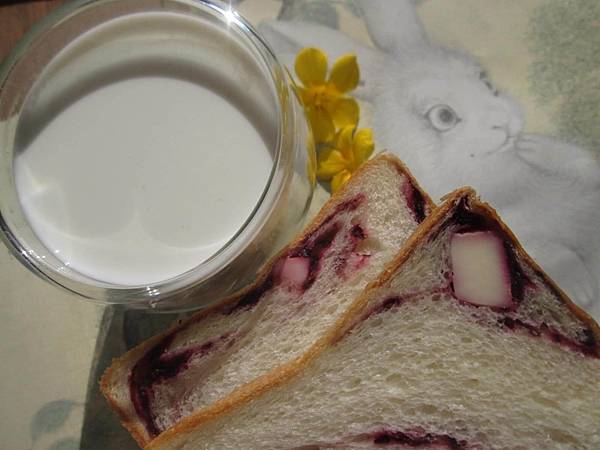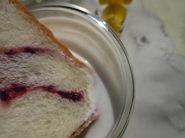「桑葚優格吐司」沾著牛奶吃,吐司不會隨便就塌掉糊掉,使用好食材做成的吐司品質與口感就是不同。吃得出來。