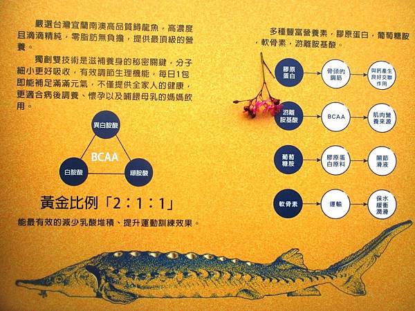 獨創雙技術萃取的鱘龍魚精華,經檢驗結果富有豐富的多樣營養素,包括膠原蛋白、葡萄糖胺、軟骨素與游離胺基酸等人體必須養份。