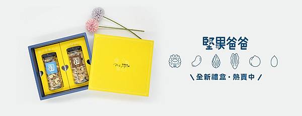 現在時令已經接近農曆過年,「堅果爸爸」也順時應勢推出了新年堅果禮盒、以黃色的外裝營造明亮爽朗氛圍。