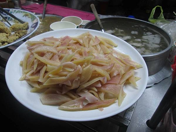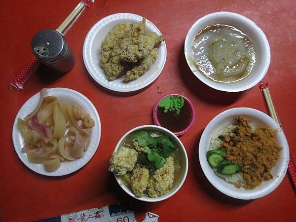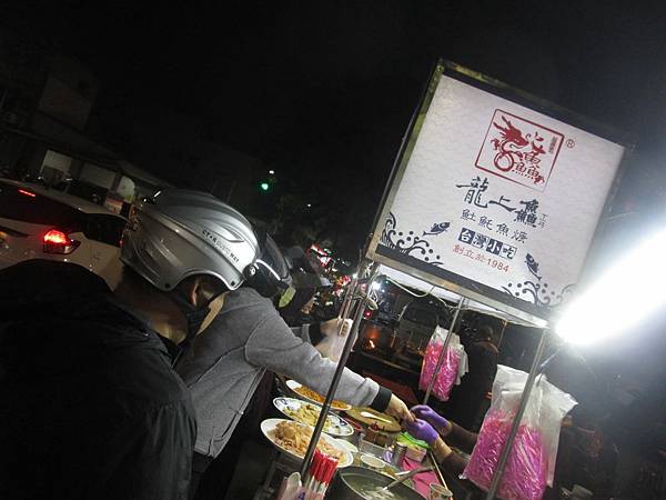 這天我們吃晚餐所在的「龍上鱻」土魠魚羹,攤子上陳列著炒麵、彰化肉圓、燙魷魚、炸土魠魚……等多樣小吃,每款小吃的預備量都很大。感覺就是有看頭的店家。
