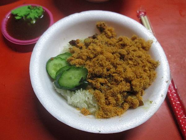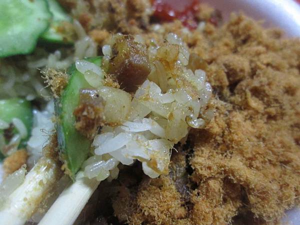 「米糕」下頭還澆有肉燥,蒸熟的糯米與帶皮肉燥很搭,小黃瓜還能去油膩。整體表現在一般水準之上。