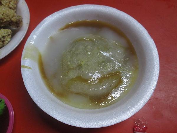 「彰化肉圓」是同事的餐點,老闆娘用剪刀在上頭剪出十字後送上。