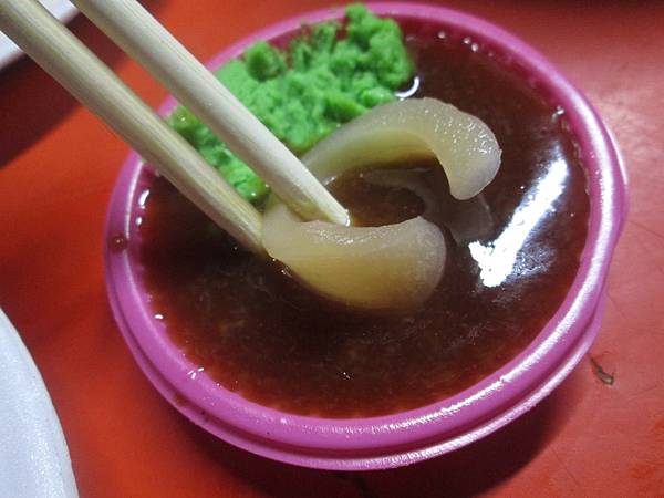 「龍上鱻」的「燙魷魚」口感Q彈、滋味鮮嫩,沾上店家獨家調製的山葵醬料很對味。這個味道可以。