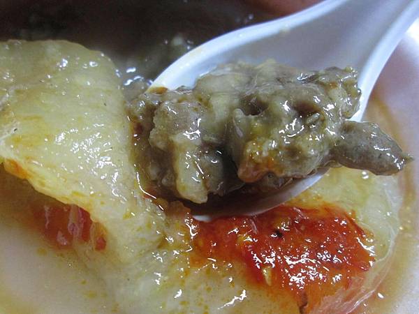 同事在肉圓上加上辣椒醬後吃得很香,稱讚說肉圓外皮口感Q彈、內餡飽滿多汁,好吃!