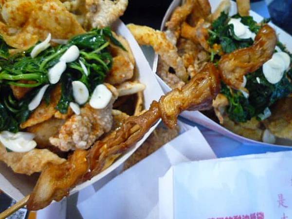 到「白妞」鹹酥雞店頭叫雞基本上不用劃菜單,直接在店頭拿挾菜盆選想吃的菜色就可以;菜色時我注意到,「甜不辣」怎麼像鬼打牆一樣一直出現?