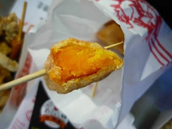 我們在等鹹酥雞不時注意到店員跟客人推薦「甘梅地瓜」,梅子粉與甘草粉讓酥炸地瓜風味更具層次。這味不錯。