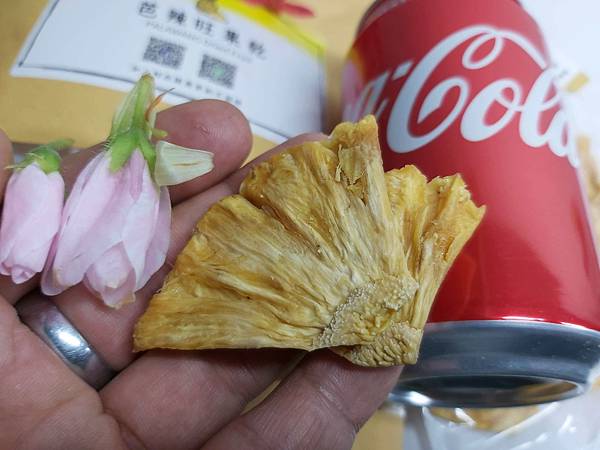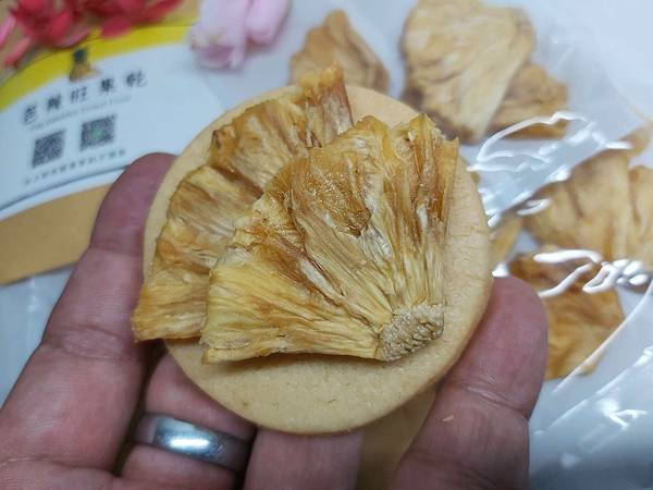 「鳳梨果乾」將鳳梨連果芯帶肉片成適口大小後再去除水份成為水果乾,打開密封包裝後飄散出不會錯的鳳梨果香。