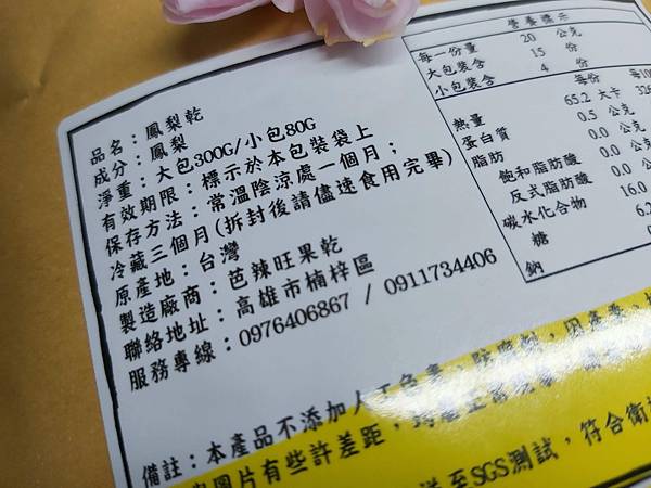 「鳳梨果乾」不添加人工色素、防腐劑等成份,營養成份主要來自碳水化合物與鳳梨本身自帶的果糖。