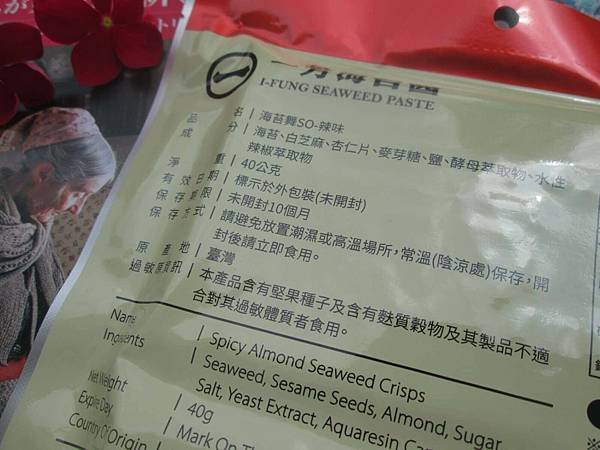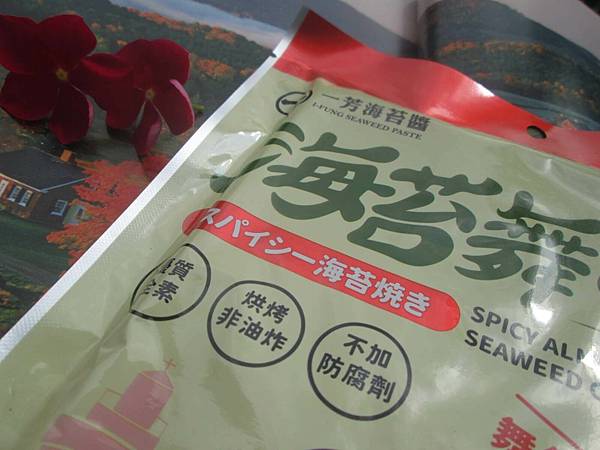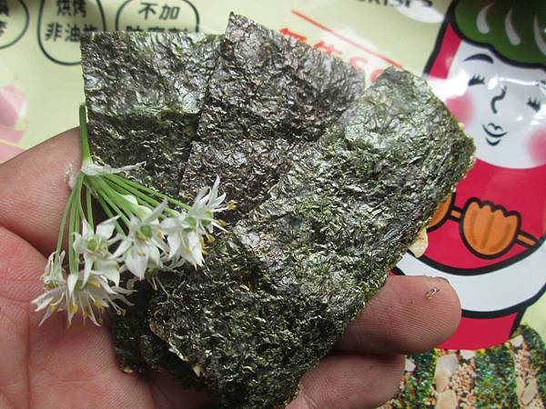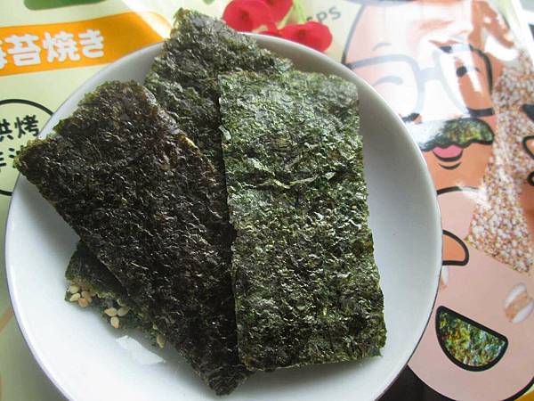 海苔片一旦離開包裝後應該迅速吃掉以免受潮,吃起來口感酥脆、在海苔香中揉合入杏仁與白芝麻的堅果香氣。香香辣辣的好吃耶。