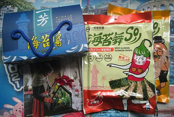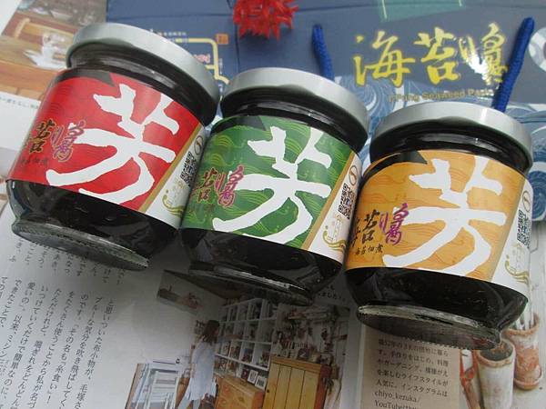 包裝盒裡是恆春傳統名產「一芳海苔醬」,共有原味、香菇與蜂蜜三種風味。