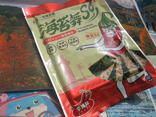 「海苔舞SO-辣味」使用紅藻「翡翠海苔」為原料、每年採收時間只有 2、3 個月很珍貴,當中包著白芝麻與杏仁片。