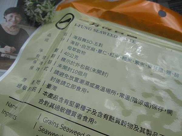 成分:海苔、白芝麻、薏仁、紅米、糙米、紫米、麥芽糖、鹽、酵母萃取物。