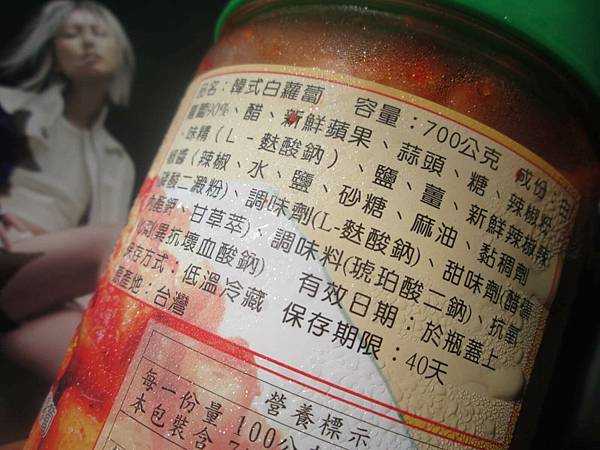 成份:白蘿蔔、醋、新鮮蘋果、蒜頭糖、辣椒粉、味精、鹽、薑、新鮮辣椒辣椒醬、水、鹽、砂糖、麻油、黏稠劑、調味劑、甜味劑、調味料、抗氧化劑