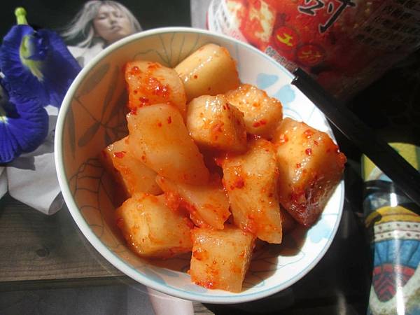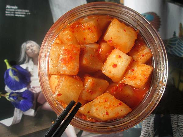 「韓式白蘿蔔」以手工切成不規則的適口大小、口感爽脆,滋味則是偏台灣人口味;真正韓式白蘿蔔滋味還要更辣要鹹、其實沒那麼適合台灣人口味,還是台版的好吃!