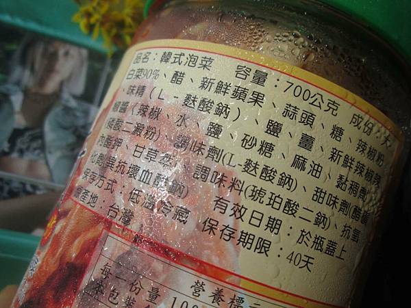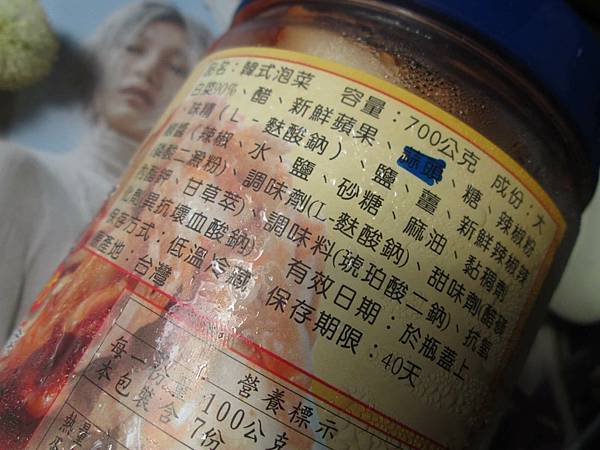 成份:大白菜、醋、新鮮蘋果、蒜頭、糖、辣椒粉、味精、鹽、薑、新鮮辣椒辣椒醬、調味劑、甜味劑、調味料、抗氧化劑