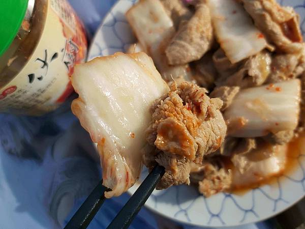 我拿「韓式泡菜」炒豬肉片、步驟是先熱好高湯後加入豬肉片煮至變色再加入韓式泡菜轉大火快炒,收汁就完成