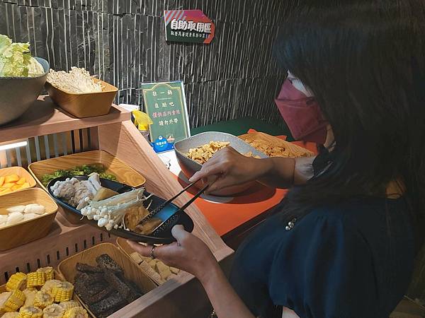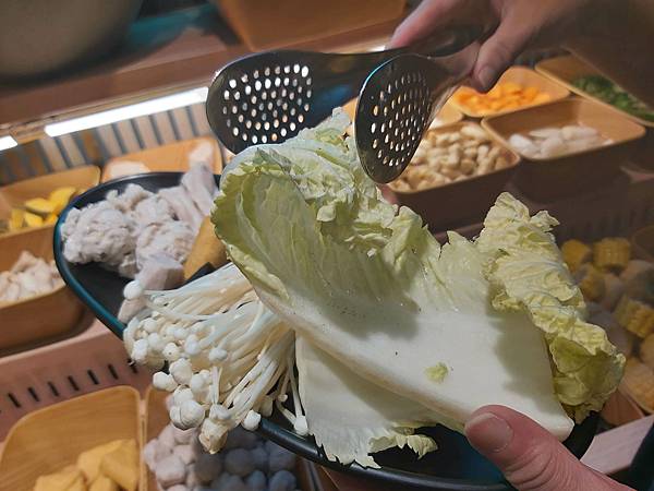 自助取用區裡擺放了各式火鍋料和新鮮蔬菜,鮮度都挺好。由於火鍋主菜我們都選擇了海鮮與肉類,可以多拿點菜類搭配吃得更健康。