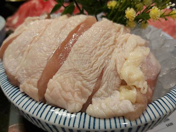 另一道店家招待的宵夜「軟嫩雞腿」也很大份,同樣是盛放在有花草裝飾的冰塊上保鮮。