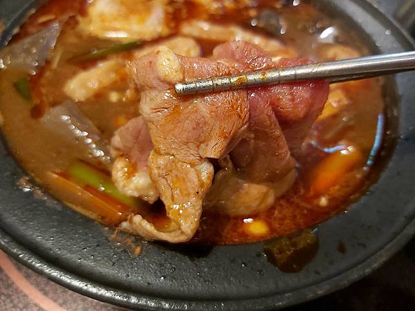 朋友用「火焰香辣鍋」涮「板腱牛」到六、七分熟就吃,顯得非常鮮嫩。同事讚美說肉質不錯、很好吃。
