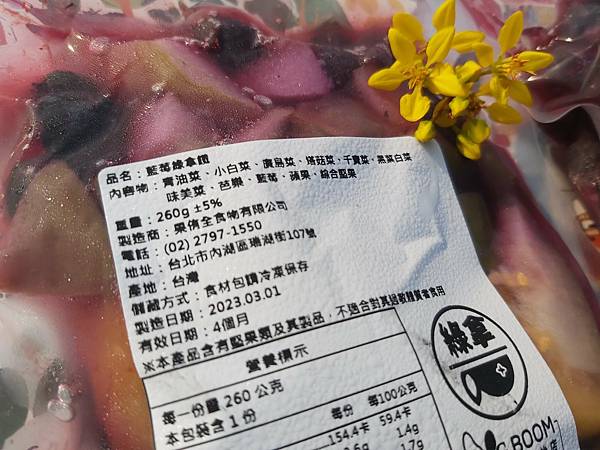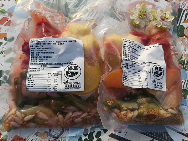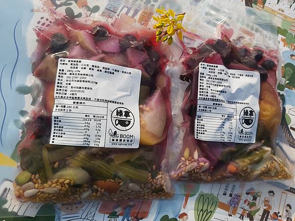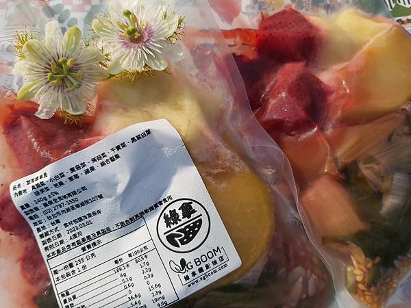 「V.G BOOM」品牌的招牌「綠拿鐵」是使用新鮮水果和有機蔬菜洗淨切塊、搭配優質堅果及穀物做成冷凍真空包。冷凍保存期限是 4 個月。