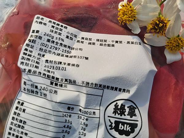 「黑莓綠拿鐵」口味一包是 240 公克,成份包括多種熟青菜如:塔菇菜、多種水果包括:黑莓、蘋果、鳳梨和綜合堅果。