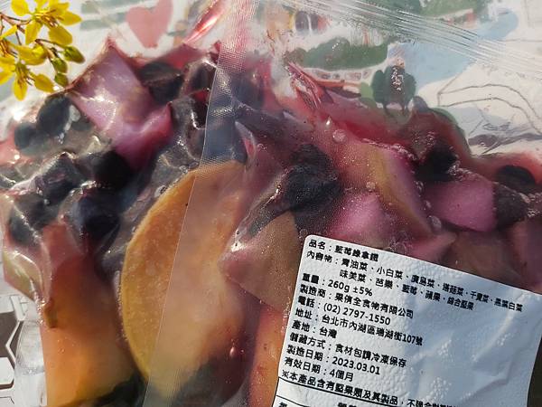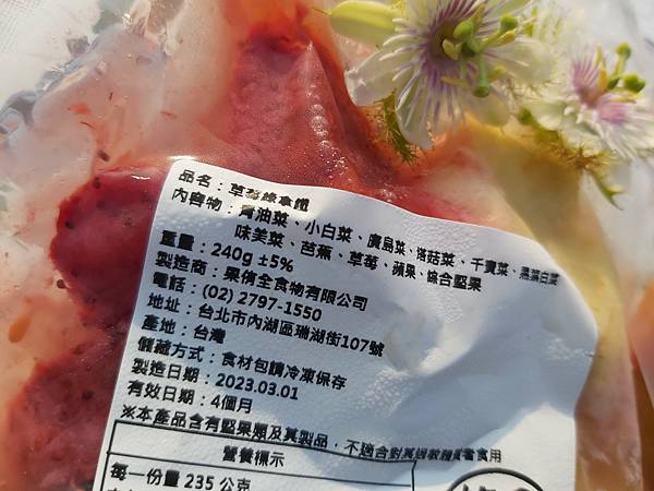 內容物:青油菜、小白菜、廣島菜、塔菇菜、千寶菜、黑葉白菜、味美菜、鳳梨、黑莓、蘋果、綜合堅果