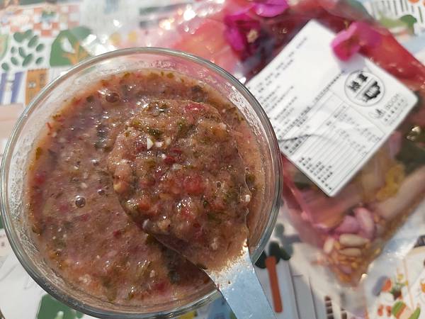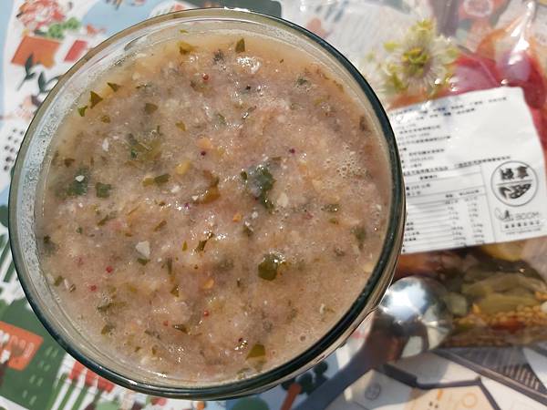冷凍包從冷凍庫拿出來後將包裝剪開、內容物倒入調理機內調理。如果所使用的果汁機馬力不足像我家的這樣,可以將鮮凍包放置常溫 10 分鐘後稍退冰後開始操作。