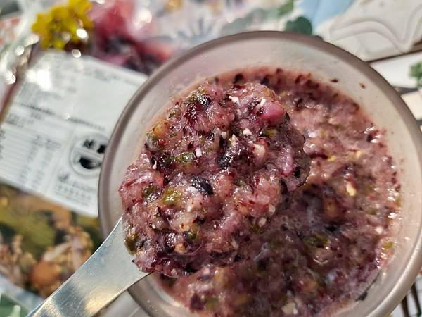 我想保持較多的食物纖維所以打得較粗、兼可省電與保護馬達;何況做成食物泥的狀態也不錯啊,給小朋友當離乳食品都可以了!