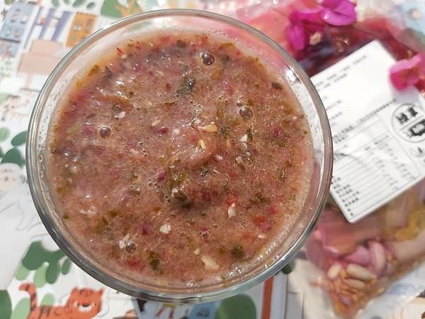 對我而言「黑莓綠拿鐵」開封就聞到一股很明顯的芒果味,加水打成飲品則呈現紅褐色的飲品。