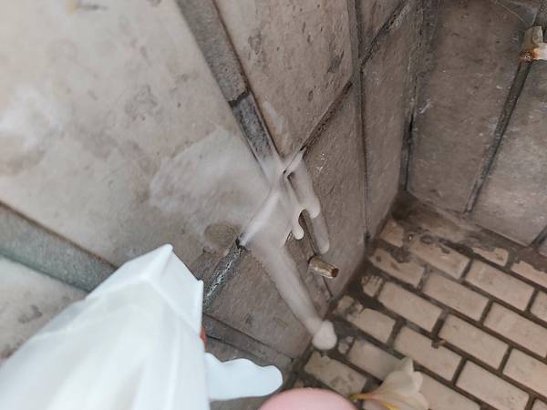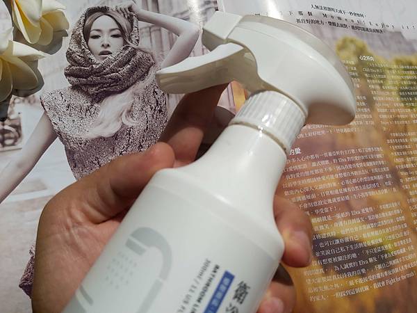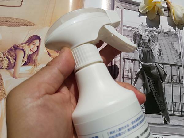 「衛浴水垢潔淨噴霧」的噴霧噴出來是白色帶細泡沫的液體,直接噴在要清除的水垢、髒污上等幾分鐘後再擦洗。