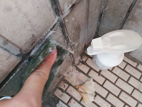 噴過我都先靜置3分鐘以上等待分解,之後再用菜瓜布或海棉擦乾淨就可以、還會形成保護層。洗手枱磁磚有噴到清潔劑的地方效果就很明顯、陳年老垢也有效。