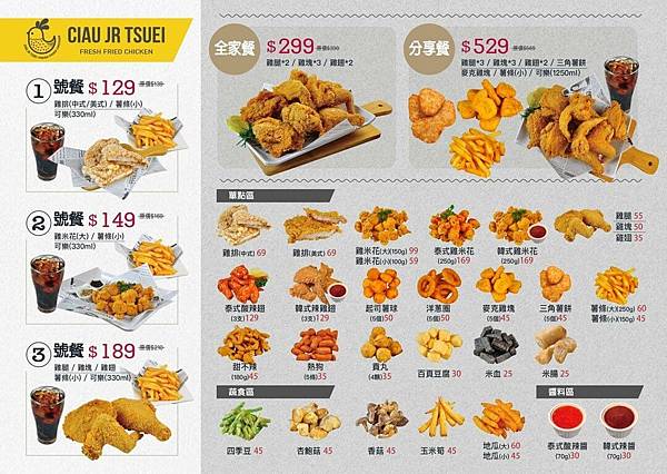 菜單包括套餐組合、全家餐、分享餐、單點區、蔬食區與飲料區,喜歡吃炸物的人看到這菜單可高興了!