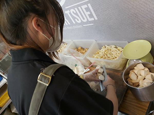 點餐後都是現點現炸、包括從準備食材都是在店面裡現做。像是蔬食區裡的杏鮑菇就準備了一大包現切現做,食材的新鮮度毋庸置疑。