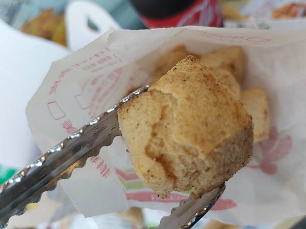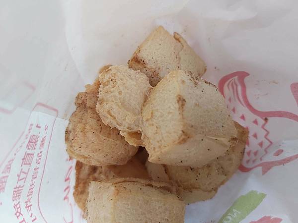 他們家「百頁豆腐」和一般鹹酥雞店的不一樣,是切成方塊狀後再油炸。倒有點像炸豆腐了。