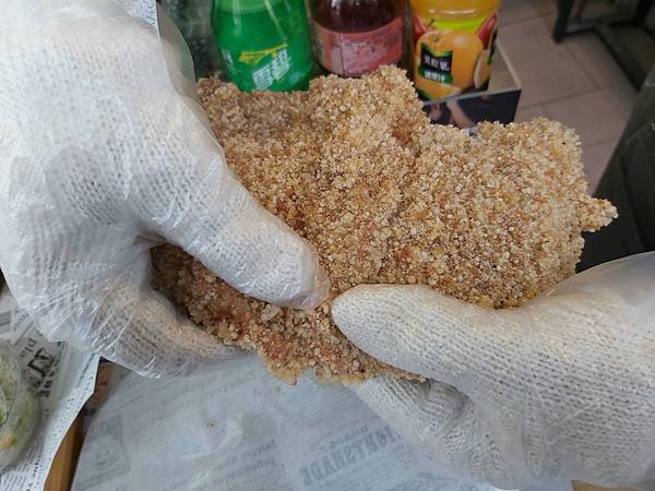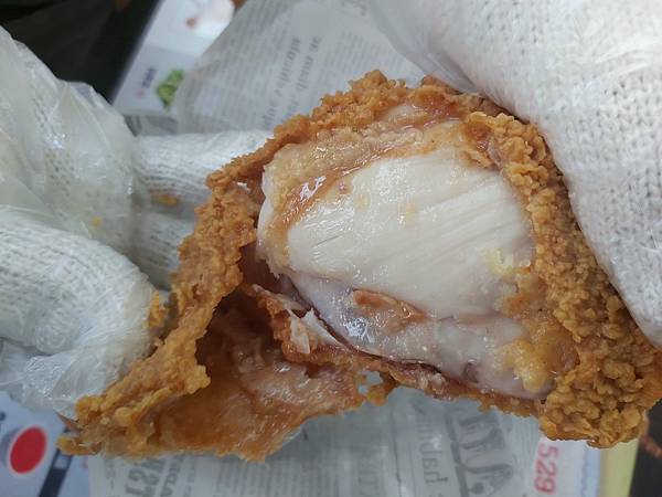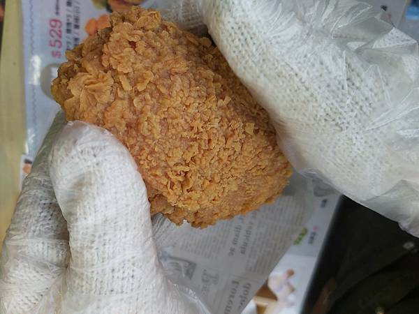 我們很專業地先戴手套外頭再覆一層塑膠手套撕開炸「雞塊」。