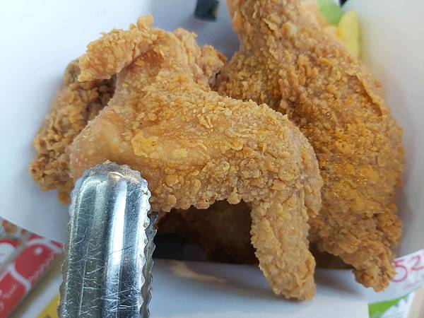 大「雞腿」炸得外酥內多汁。原本我還擔心雞腿厚度那麼厚怕會炸不熟,結果人家果然是專業炸雞店炸到連關節處都有熟、很厲害。