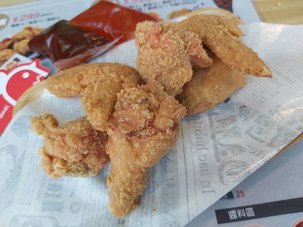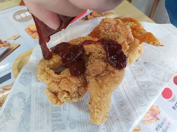 「雞翅」炸得很好、外脆內軟,可以搭配店家另一樣自調的「糖醋醬」變化口味很搭。