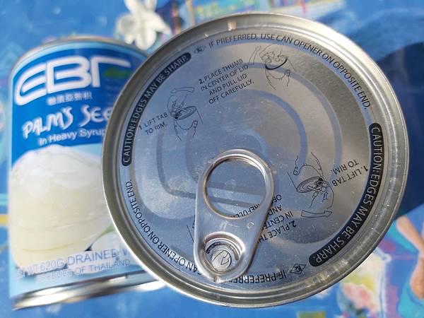 這次全聯新上價的「EBF」亞答枳來自泰國、以易開罐拉環罐頭為保裝,產品說明包裝紙以藍色為底色。