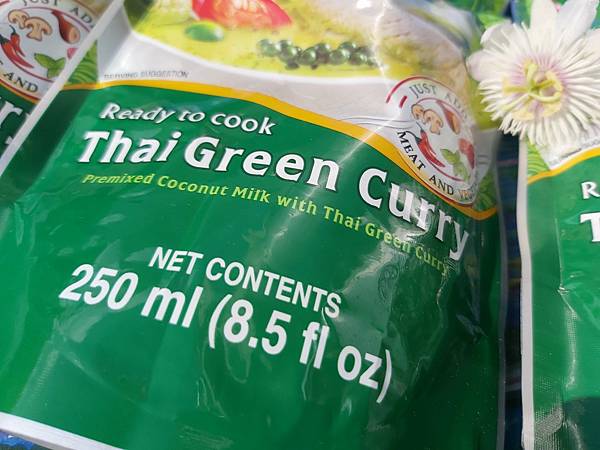 「綠咖喱醬」成份包括:椰奶、水、青咖哩醬、棕櫚油、糖與魚露等食材,因為加入了椰奶讓整體的滋味更濃醇溫和、降低了綠辣椒的嗆辣度,料理時不須另外調味開封就可以使用。便利性很高。