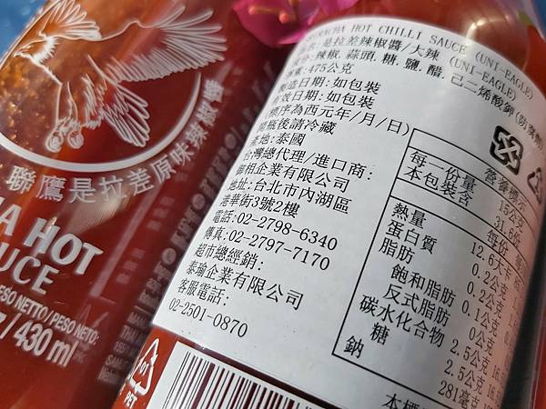 這牌「聯鷹牌是拉差辣椒醬」以熱量低為特色、是重口味辣椒醬,吃起來滋味鮮辣濃稠、有一點辣,用來搭配炸物、海鮮或當做醃料等調理方式正合適。