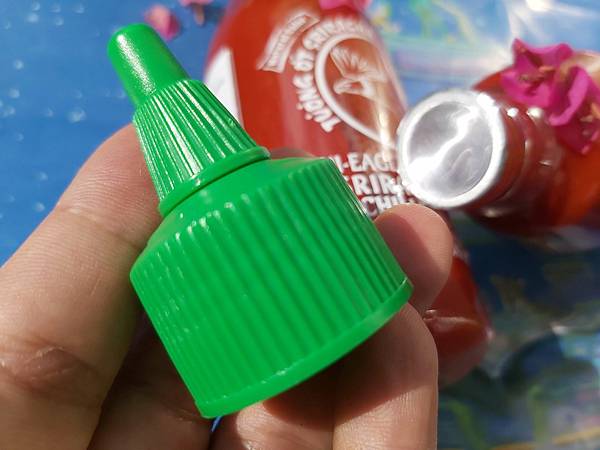 擠醬瓶的瓶口由鋁箔封住、掀掉後再將綠色的瓶蓋裝回去,之後只要旋轉上面的小蓋再將罐子倒著就可以擠出醬料來了、好擠也很好控制用量。