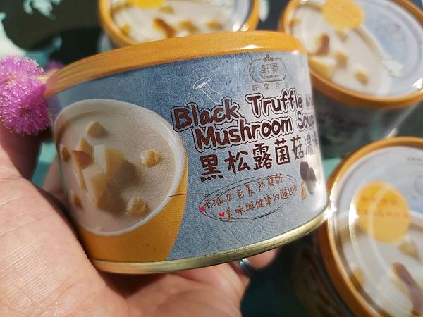 「異國濃湯」系列之「黑松露菌菇濃湯」罐頭上是濃的圖樣,寫著「即開即飲,常溫保存的好湯」標示出食品特色。